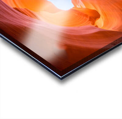 Our sublimated prints infuse dye directly into the metal panel. The end result is a glossy piece of art work. Your image is infused directly into the metal as opposed to being on the surface. Therefore, it is extremely scratch resistant. The panels are only offered in certain sizes and can be ordered in float or float frame styles. The thickness of the panel is a little less than the 3/16 dibond.